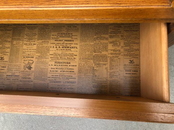 Chest of drawers – tall chest with five drawers. The top drawer has a curved front. All of the drawers have a “newspaper” lining design on the bottom (see photo). 33 inches wide; 21 inches at the deepest part of the curved front; 53 inches tall.