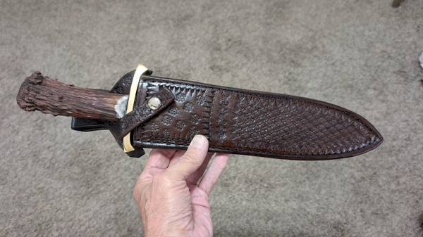 The superior stainless steel blade measures 11-inches long. Its hidden, or stick, tang is deeply inserted into a shed elk spike antler and permanently attached with industrial strength epoxy. The spike was treated with potassium permanganate to achieve the dark natural color, sanded and polished. After crafting the knife, it was shipped to one of the foremost leather sheath makers in the country, Albert Thomas. He and his wife, Karen, operate the eBay store alscrafts. The sheath was custom handmade to fit the dagger and shipped back to me.